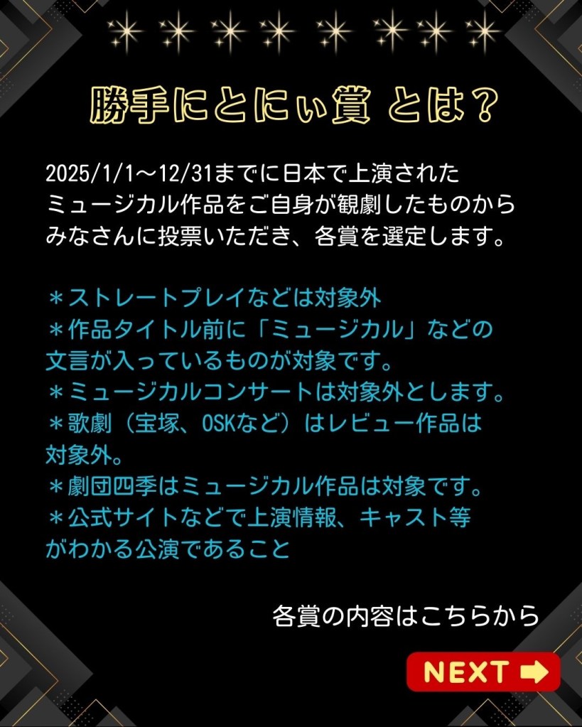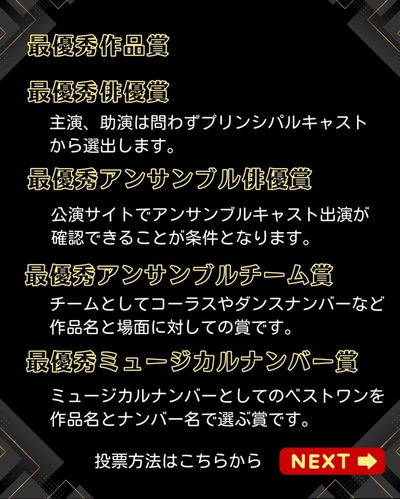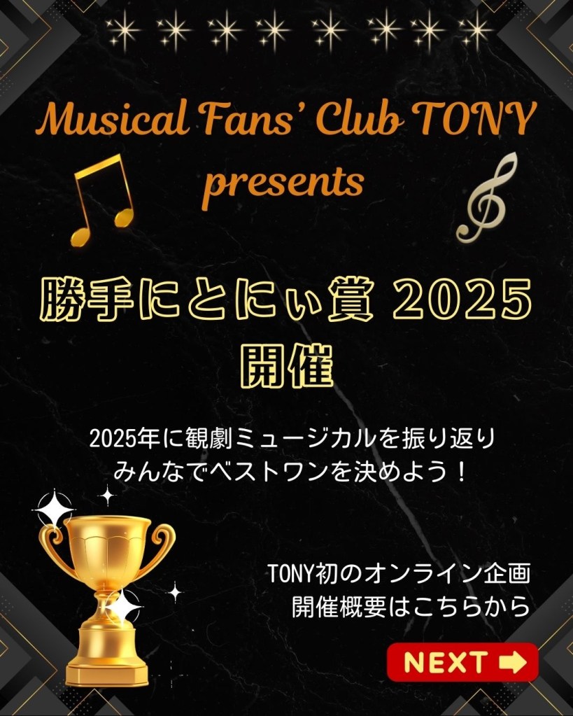 ブロードウェイTONY賞のような華やかなステージを日本でも観たいと思いませんか?好きな俳優さん、好きな演出家さんなどが、その華やかな舞台に上がっているところを見たいと思いませんか?ミュージカルファンならば……